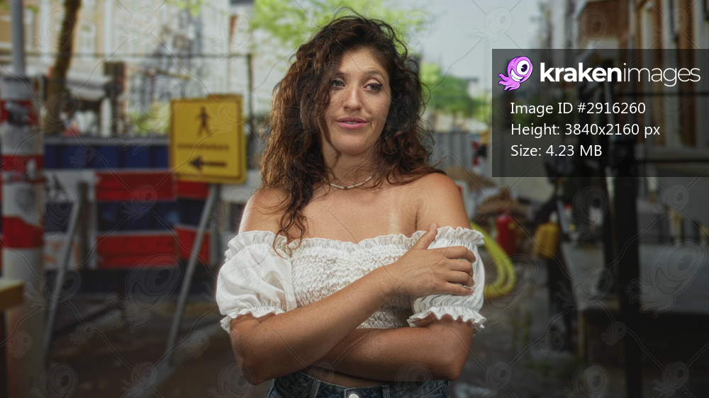 Woman with arms crossed holding shoulder in white off shoulder blouse on street beside construction barriers and warning sign; confidence resilience.