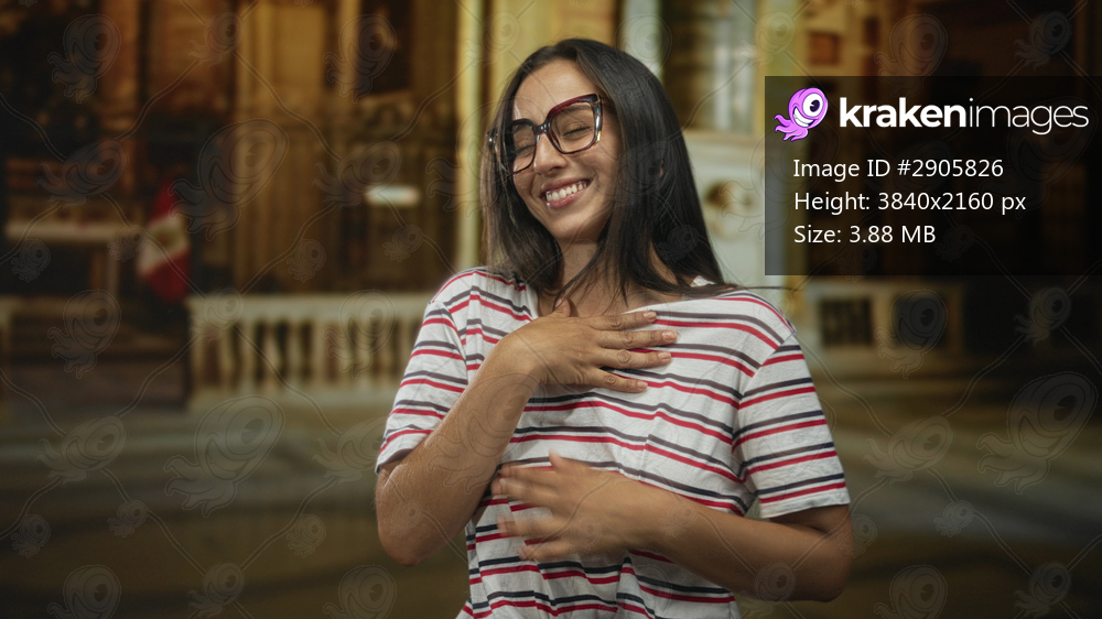 Woman with arms crossed hugging chest and smiling inside a church building wearing striped t shirt and glasses; gentle joy.