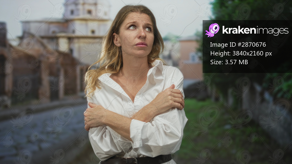 Woman with arms crossed hugging her chest on a cobblestone street while looking upward; concern introspection resilience.