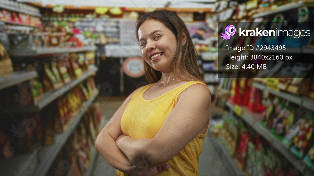 Woman with arms crossed in building aisle of supermarket wearing yellow tank top and smiling; confidence independence.