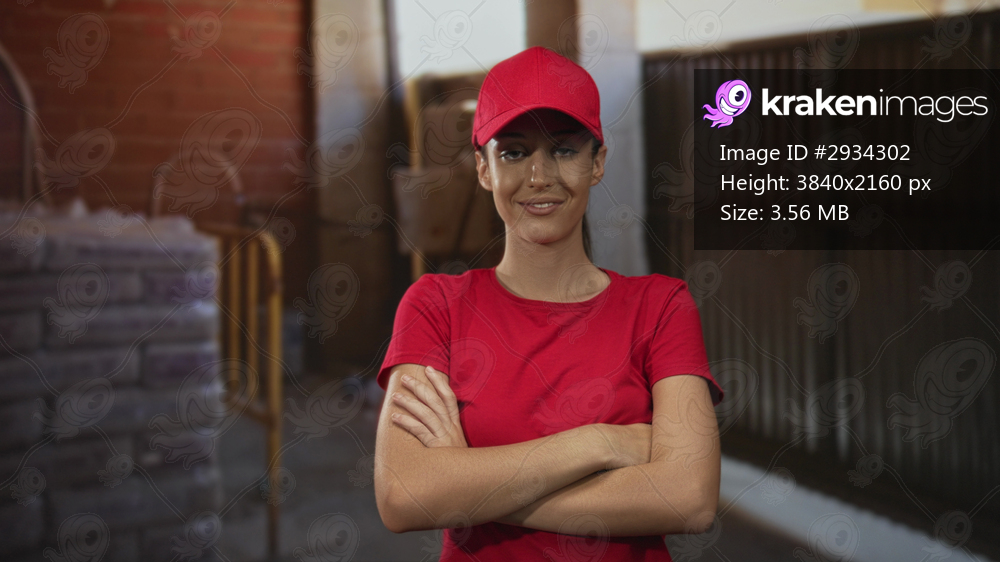 Woman with arms crossed in building interior wearing red cap and shirt; confidence teamwork reliability diligence.
