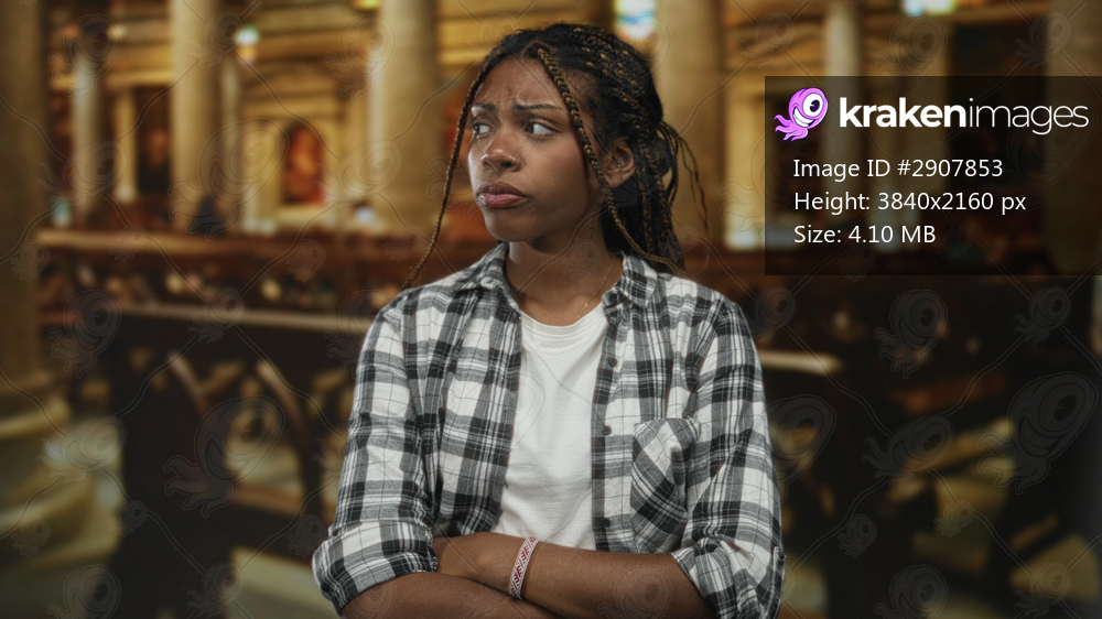 Woman with arms crossed in church building wearing plaid shirt and nose ring, eyes closed and frowning; quiet contemplation.