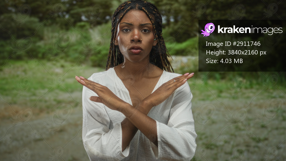 Woman with arms crossed in forest wearing white blouse, hands crossed over chest and braided hair visible; rejection.