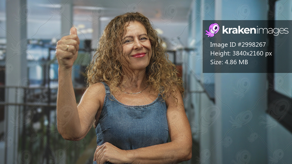 Woman with arms crossed in sleeveless denim tanktop standing in building corridor with railing and plants visible; calm confidence.