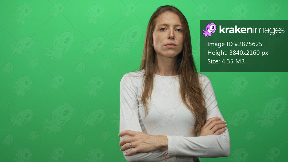 Woman with arms crossed, looking sideways and slightly away, wearing white long sleeve top in studio with bright green backdrop; doubt.
