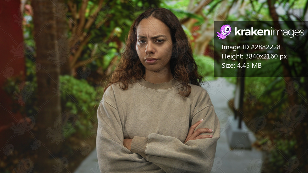 Woman with arms crossed and narrowed eyes standing on street pathway lined with green plants and trees in a park wearing beige sweatshirt; frustration. - Kraken Images