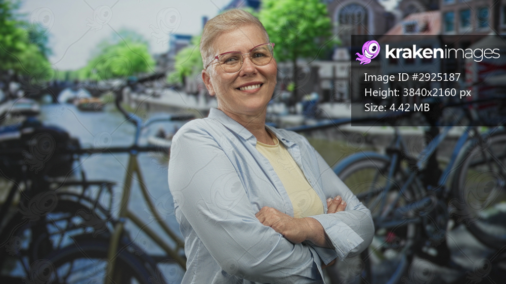 Woman with arms crossed near parked bicycles by a canal railing on a street in amsterdam; confidence resolve.