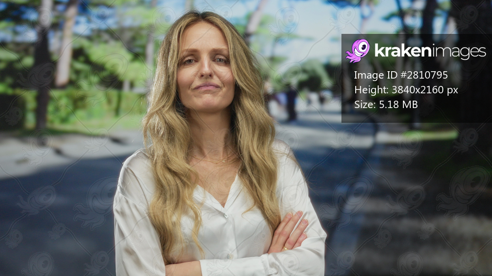 Woman with arms crossed, nervous in park, blonde young model pauses in green outdoors biting lip.