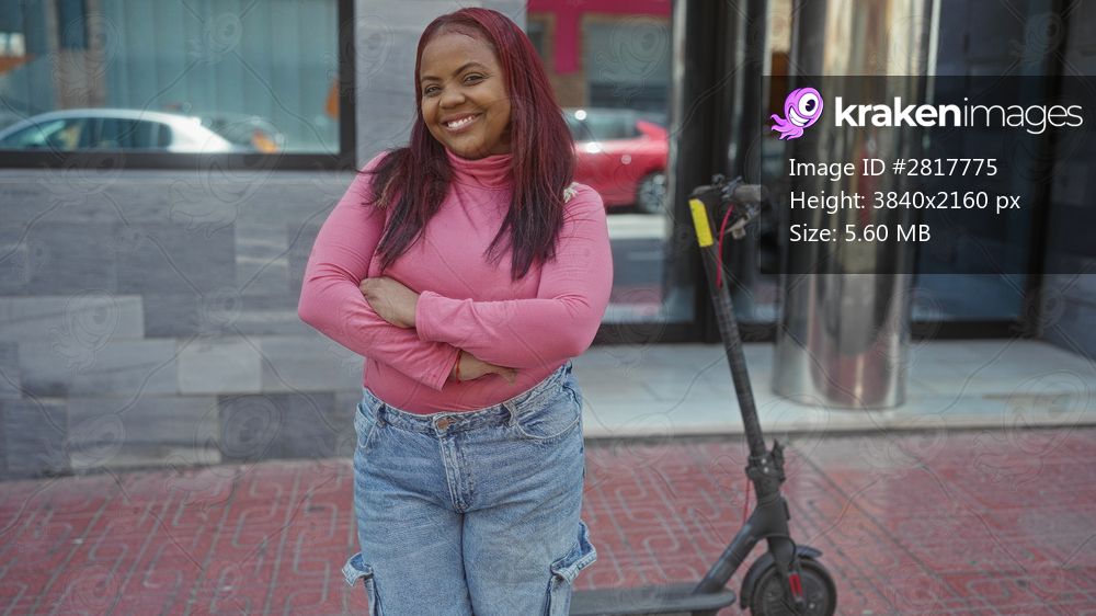 Woman with arms crossed next to scooter on sunlit busy city street; confidence independence mobility adventure.
