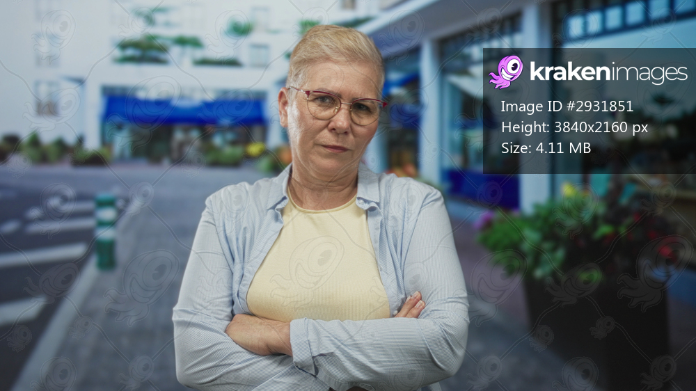 Woman with arms crossed on a busy city street in front of storefronts, wearing glasses and a striped shirt; disapproval.
