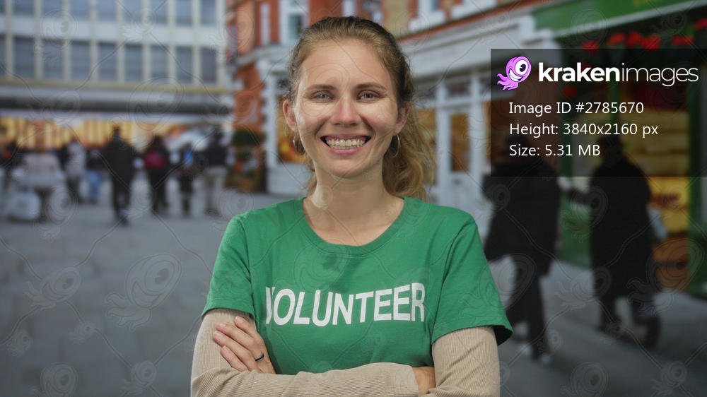 Woman with arms crossed on a festive street looks like a blonde young volunteer wearing a green shirt and smiling at the market.