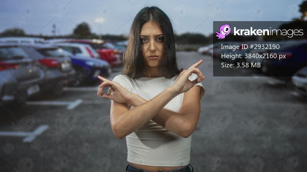 Woman with arms crossed on a street parking lot among cars, clearly stern expression; frustration solitude.