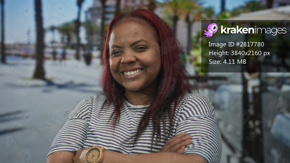 Woman with arms crossed on a sunny seaside street promenade wearing striped shirt and wooden watch; confidence.