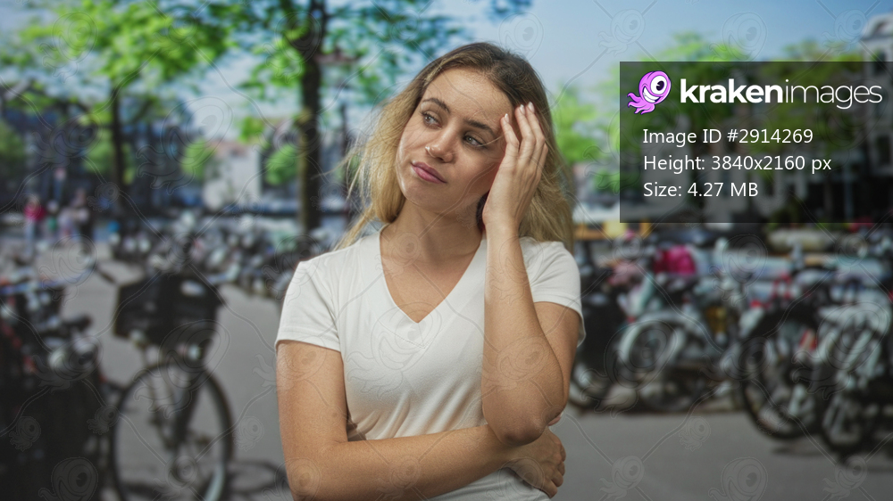 Woman with arms crossed on amsterdam canal street, hand brushing hair amid parked bicycles and canal buildings; contemplation.