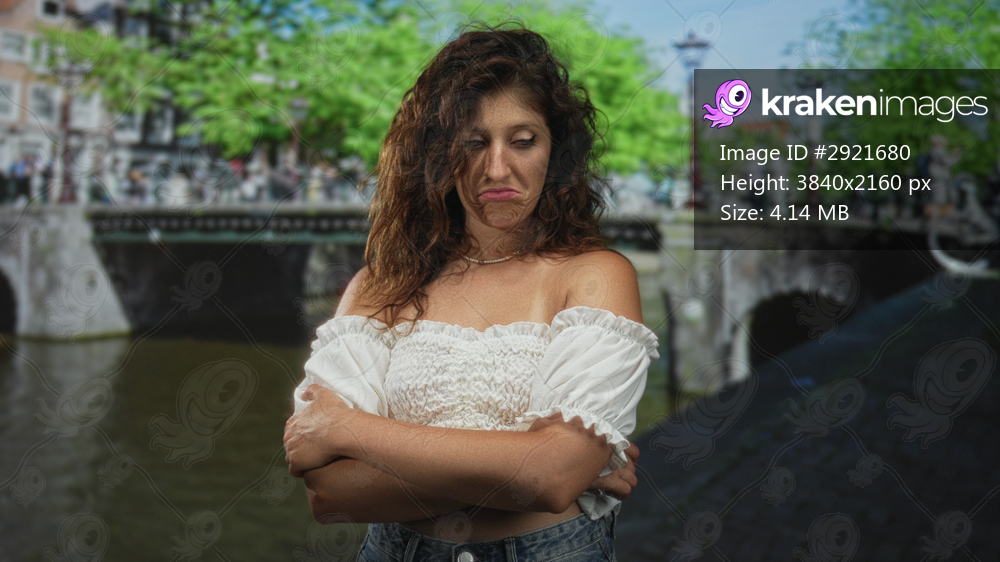 Woman with arms crossed on street by amsterdam canal bridge, wearing off shoulder blouse; defiance rejection.