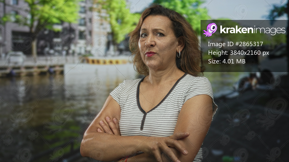Woman with arms crossed on street by amsterdam canal building facade under sunlight; confidence and resilience.