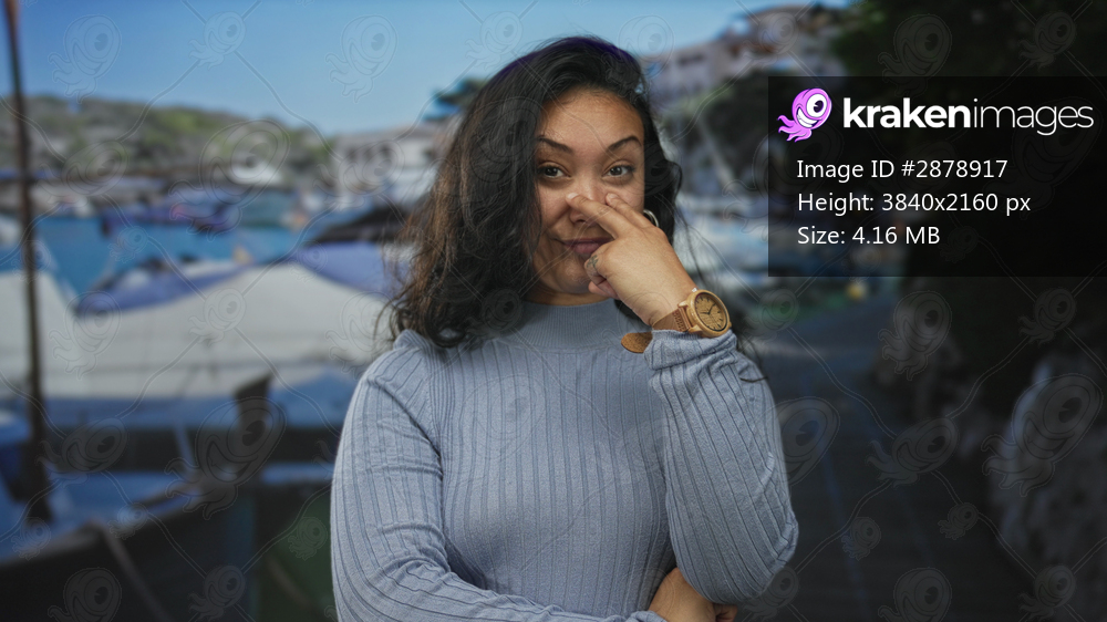Woman with arms crossed on street by moored boats at a port marina walkway, wearing sweater and wooden watch; defiance.