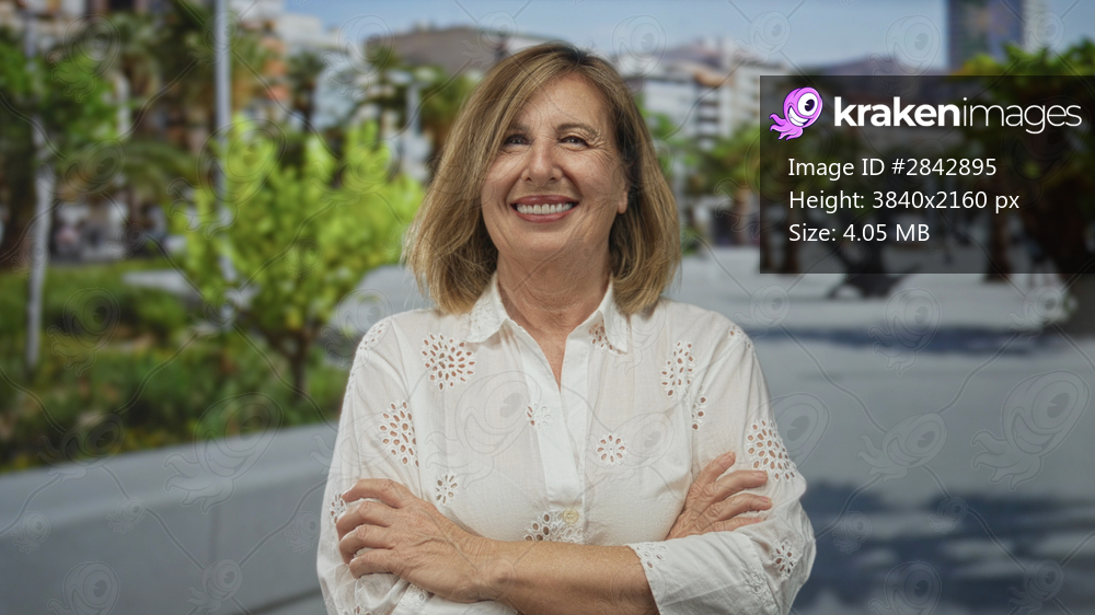 Woman with arms crossed on street lined with palm trees and highrise buildings, smiling confidently at camera; confidence.