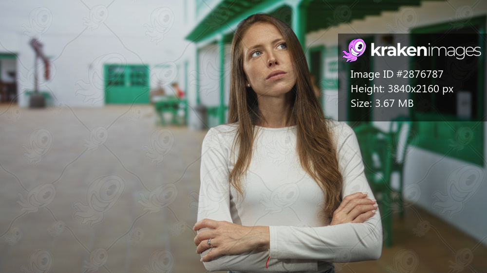 Woman with arms crossed outside a white building, folded hands showing ring and steady gaze to the side; contemplation resilience.