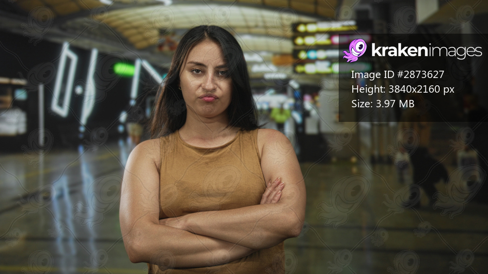 Woman with arms crossed and pursed lips in airport terminal near departures board, standing with sleeveless top; travel frustration.