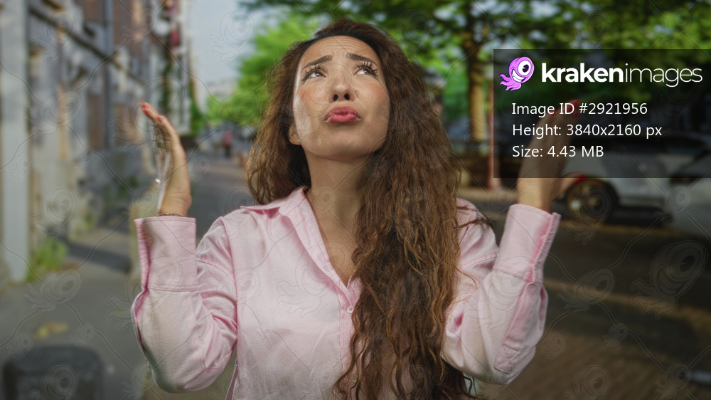 Woman with arms crossed and pursed lips on street beside parked cars and urban trees; frustration waiting.