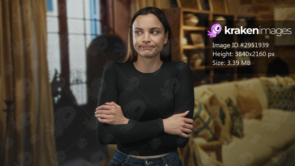 Woman with arms crossed, pursed lips, standing in a living room inside a building; annoyance rejection.