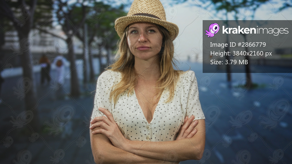Woman with arms crossed showing cleavage on city street promenade wearing straw hat and polka dot dress near tree lined walkway; wry skepticism.