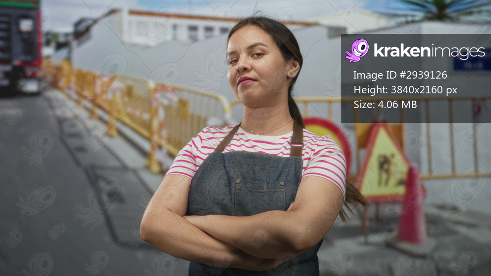 Woman with arms crossed showing forearms on a street construction site guarded by barriers and cones; confidence resilience resolve.
