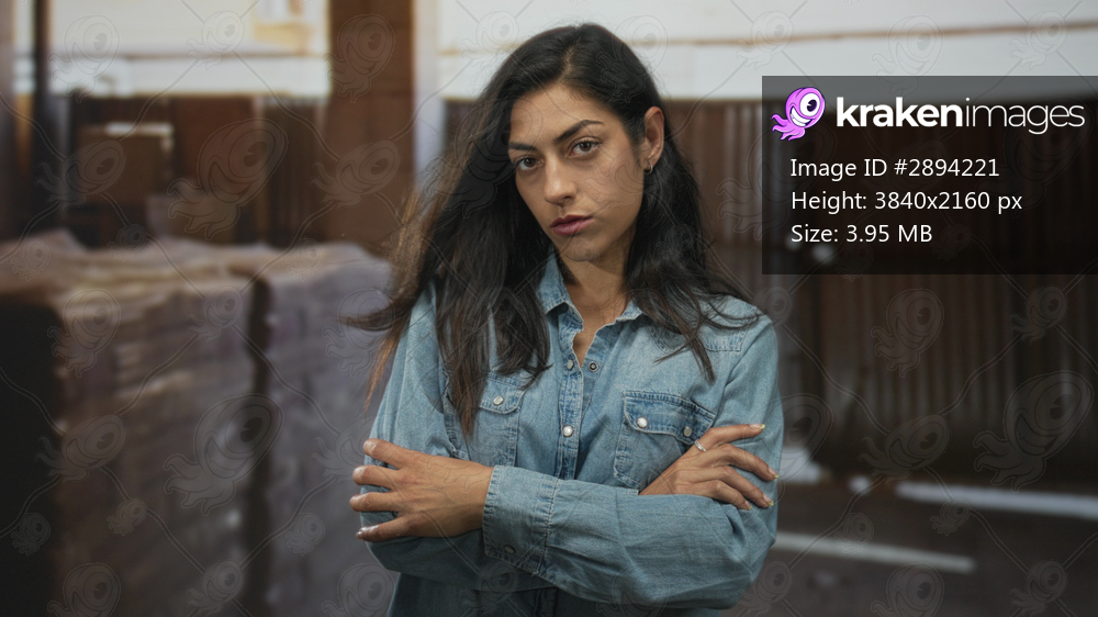 Woman with arms crossed showing hands and wearing denim shirt in building interior at construction site; quiet defiance.
