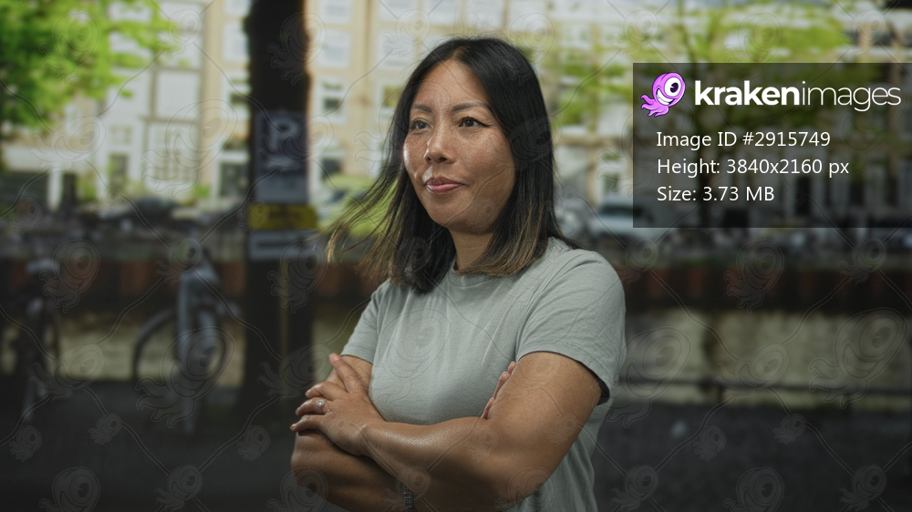 Woman with arms crossed showing ring on hand on amsterdam street by canal houses and parked bikes; confidence determination.