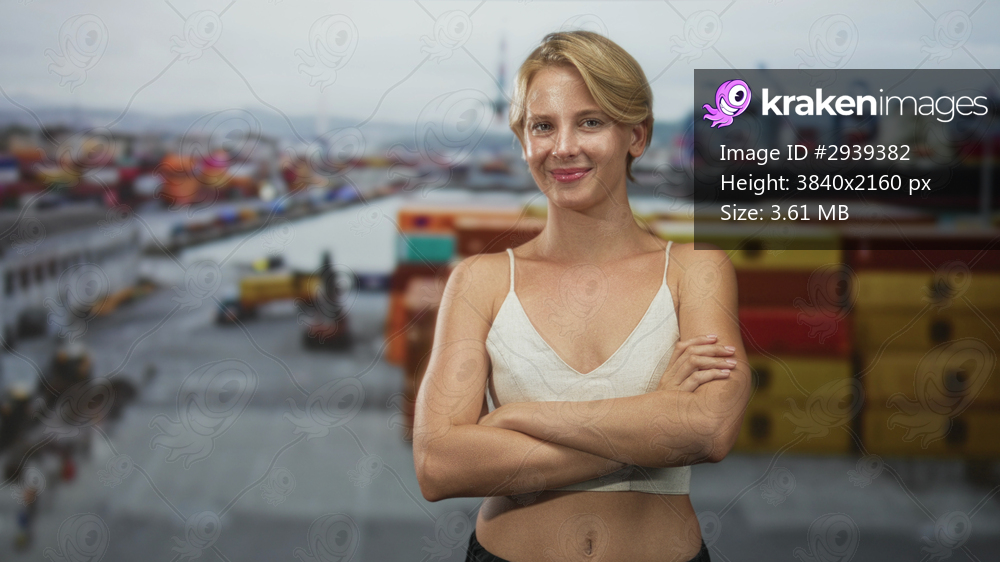 Woman arms crossed smiling at a busy shipping port with stacked containers and cranes building; confidence adventure.