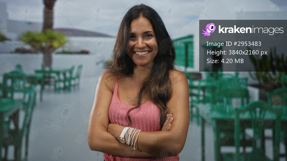 Woman with arms crossed smiling in a pink tank top at an outdoor restaurant terrace by a building with green chairs and cactus; confidence leisure.