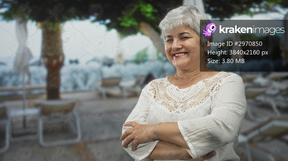 Woman with arms crossed smiling, white lace top and bracelet on a seaside street with loungers and umbrellas; contentment relaxation.