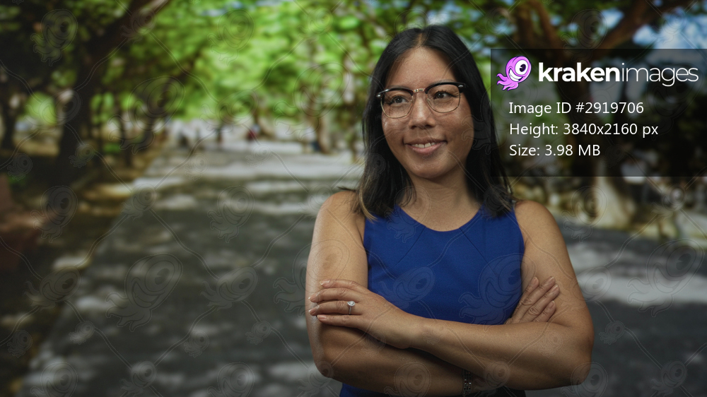 Woman with arms crossed standing on a forest path wearing a blue sleeveless dress and glasses, smiling gently; confidence leadership.