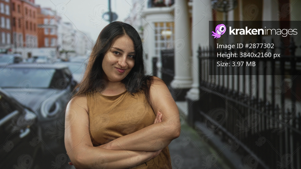 Woman with arms crossed and tilted head, wearing brown sleeveless shirt on city street; confidence authenticity attitude.