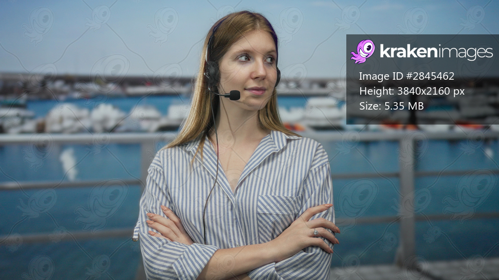Woman with arms crossed wearing a headset at a port dock overlooking moored boats by the sea; rejection.