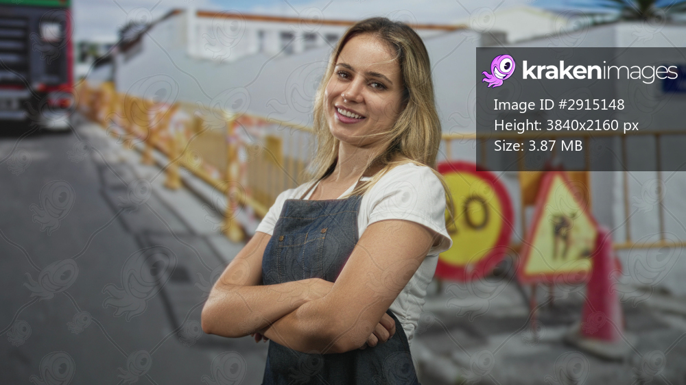 Woman with arms crossed wearing denim apron on a street next to construction barriers and warning signs; confidence denial.