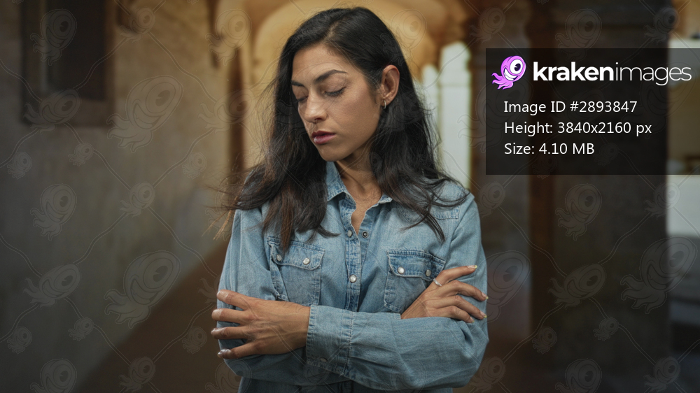 Woman with arms crossed wearing denim shirt with visible hands in old town building; pensive reflection.