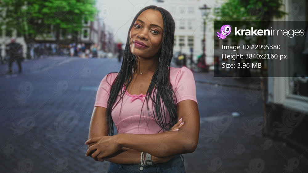 Woman with arms crossed wearing pink top and bracelets on a cobblestone street, facing camera with slight smile and braids; quiet friendly confidence.