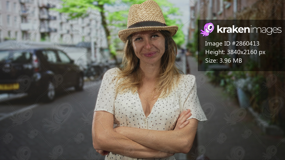 Woman with arms crossed wearing straw hat and polka dot dress on a narrow city street with parked car and planters visible; confidence independence.