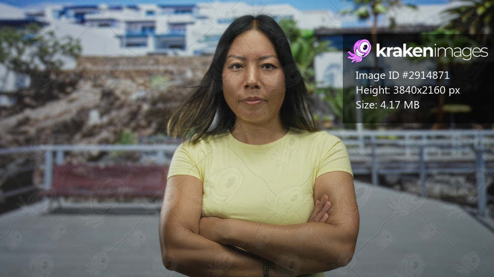 Woman with arms crossed wearing yellow tshirt on a sunny boardwalk in front of a building and palm trees, facing camera with stern expression; disapproval. - Kraken Images