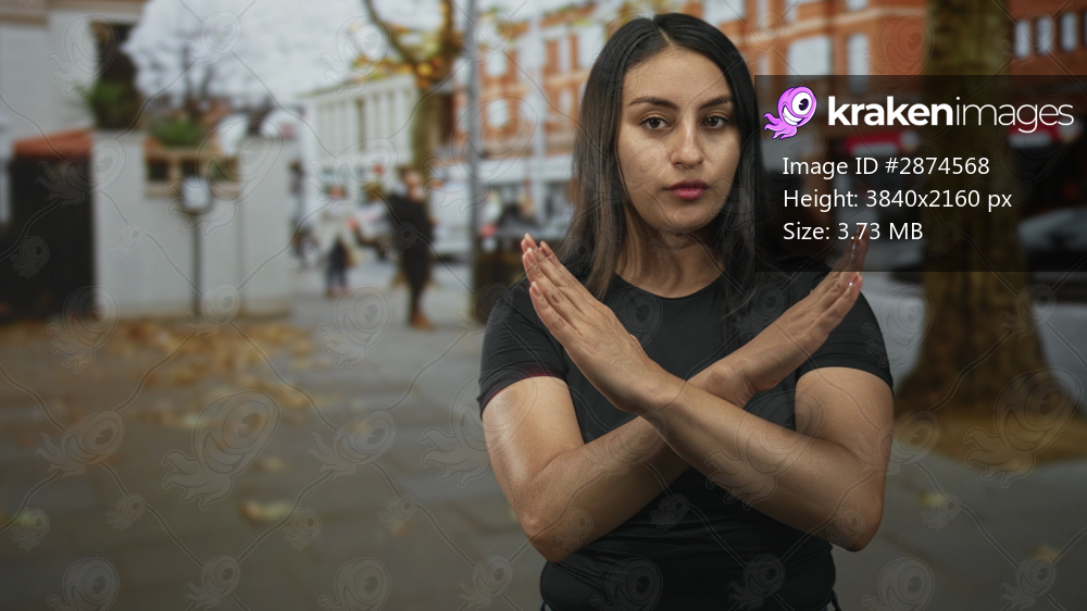 Woman with arms crossed x forming an x gesture on a street, bare forearms visible; rejection boundary.