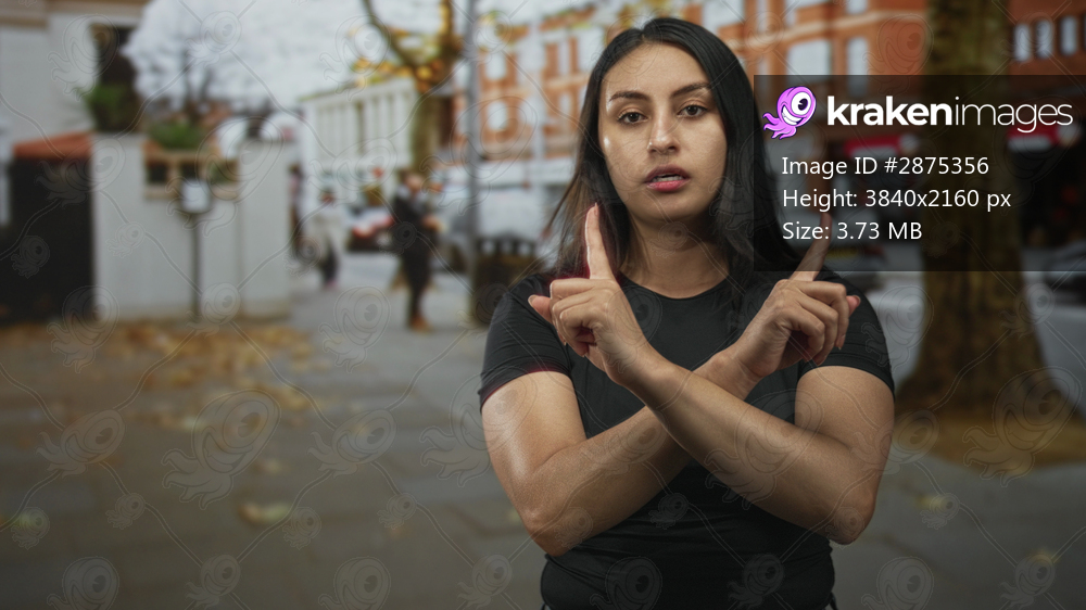 Woman with arms crossed x forming an x gesture on a street, bare forearms visible; rejection boundary.
