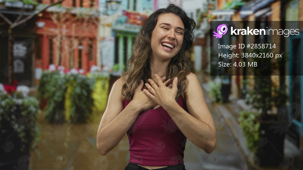 Woman with arms extended in welcoming hug on vibrant cobblestone street flanked by lush potted plants; joyful welcome.