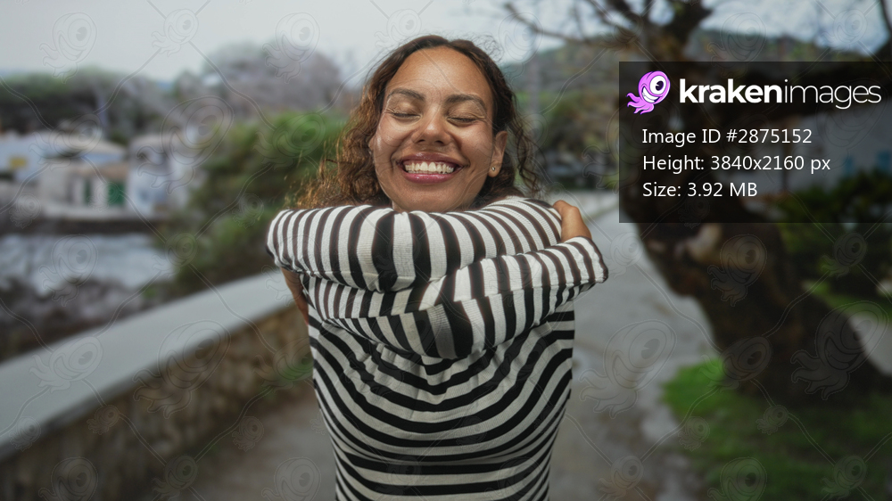 Woman with arms extended reaching toward camera on street promenade by the seaside, smiling with eyes closed; joyful embrace.