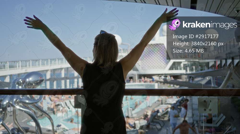 Woman with arms outstretched at cruise deck rail overlooking swimming pool and sunbathers; joy relaxation.