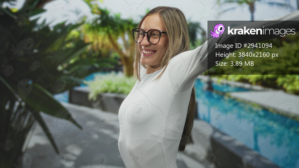 Woman with arms outstretched by a pool at a hotel building, smiling and wearing glasses; joyful relaxation.