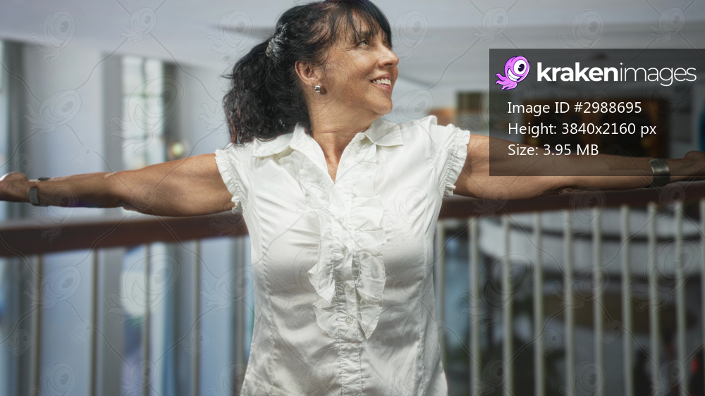 Woman with arms outstretched and head tilted up in building atrium, wearing white ruffled blouse and metal cuff bracelet; joy liberation.