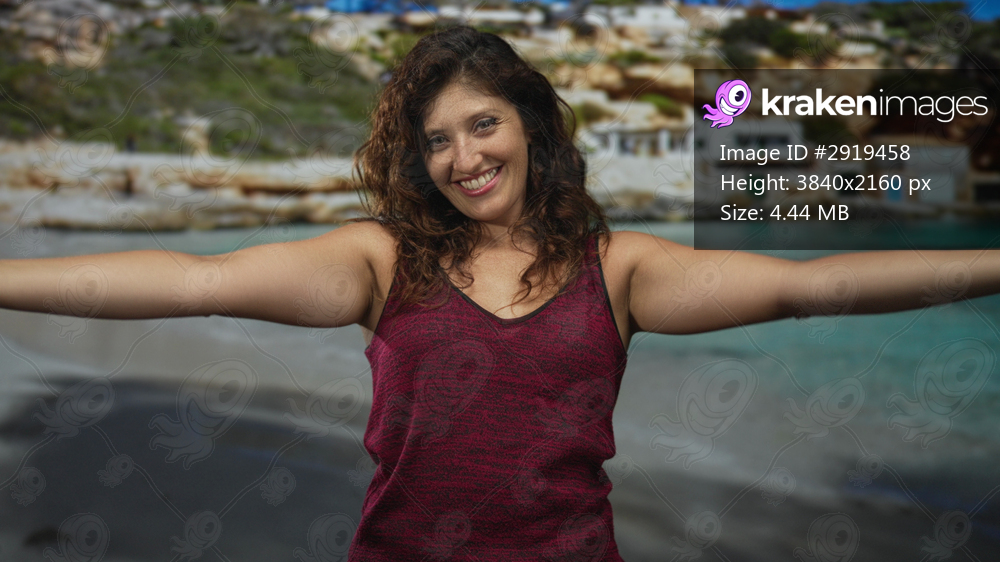 Woman with arms outstretched showing bare forearms and smiling on the beach by a small white building, wearing a sleeveless burgundy top; carefree joy. - Kraken Images