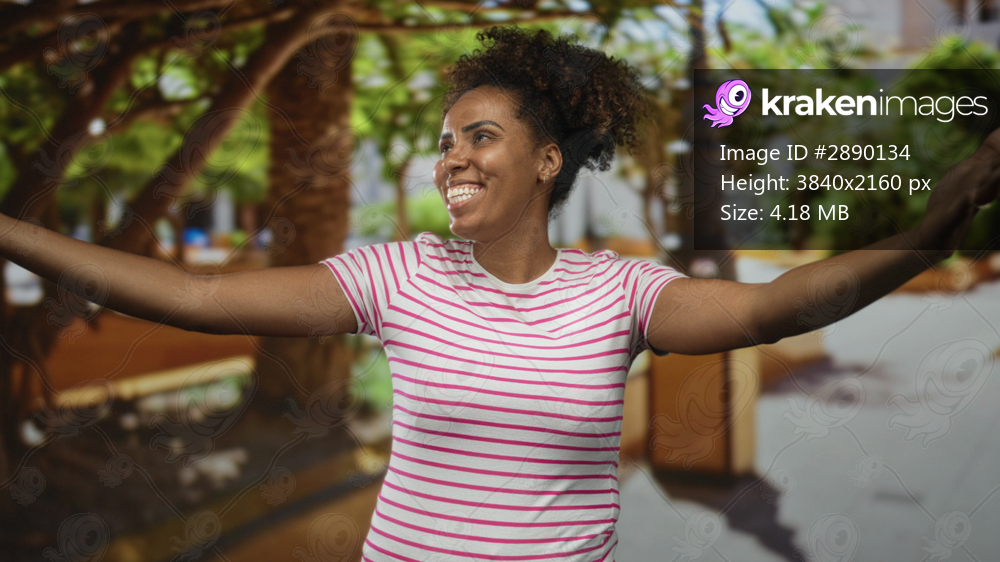 Woman with arms outstretched smiling broadly on a busy street plaza, visible forearms and casual striped tee; joy.